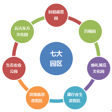 項目規劃:項目具有幸福文化景區、休閑旅游度假、婚慶消費中心、休閑商業商務及生態美居五大產業功能,總體規劃成為七大功能區:媽祖感恩園、百福園、婚禮文化博覽園、遠古東方文化園、濱海旅游度假區、康療養生度假區、生態森林公園。